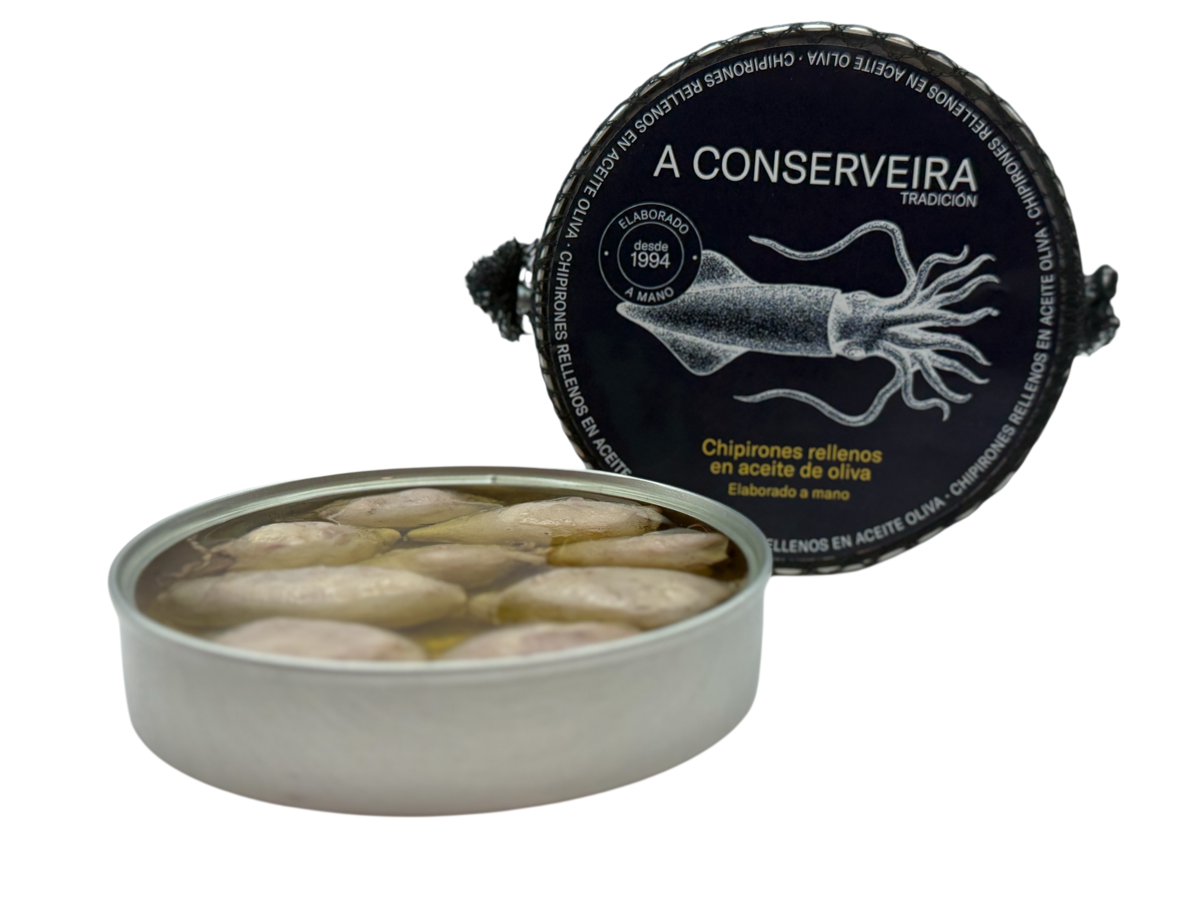 Se limpian y enlatan con esmero, preservando su textura tierna y su sabor exquisito. Somos muy meticulos con la limpieza del calamar, el cuál se separa en dos partes, cociéndose por separado las cabeza, y posteriormente rellenandose esta cabeza solo con los propios tentaculos, todo ello de forma manual.